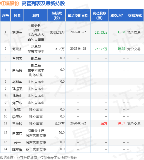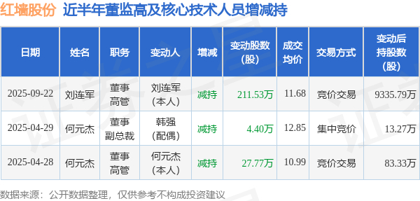 红墙股份近半年内的董监高及核心技术人员增减持详情如下: