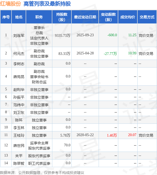 红墙股份近半年内的董监高及核心技术人员增减持详情如下: