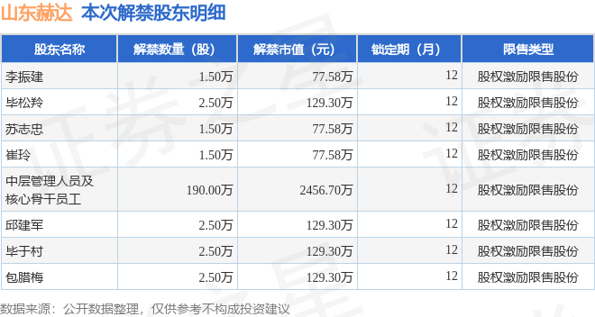 证券之星消息,根据市场公开信息整理,山东赫达(002810)于11月28日将有204.5万股限售股份解禁,为公司股权激励限售股份,占公司总股本0.59%。(本次数据根据历史公告整理得出,实际情况以上市公司最新公告为准)本次解禁后,公司还有2608.18万股限售股份,占总股本7.49%。具体如下图所示: