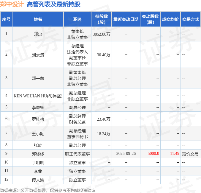 证券之星消息,根据9月29日市场公开信息、上市公司公告及交易所披露数据整理,郑中设计(002811)最新董监高及相关人员股份变动情况:2025年9月26日公司董事郭缘缘共增持公司股份5000.0股,占公司总股本为0.0016%。变动期间公司股价上涨2.67%,9月26日当日收盘报11.91元。
