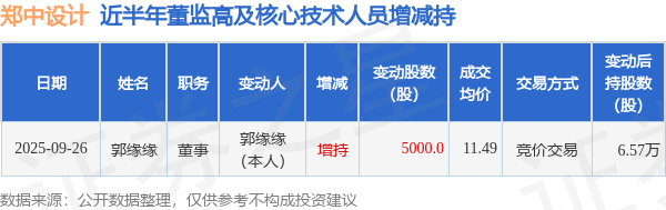 郑中设计:9月26日高管郭缘缘增持股份合计5000股