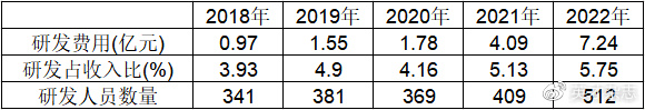从研发角度来看,公司在研发方面的投入还是舍得的。2021年,公司研发支出4.09亿,2022年公司研发支出7.24亿,同比增长77%,研发人员数量也在稳定增加,同时研发支出占总营收的占比也在升高。