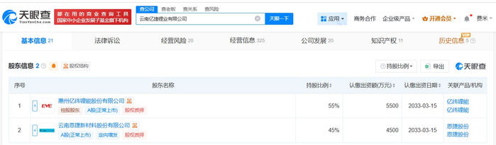 云南亿捷锂业有限公司成立于2023年3月,法定代表人为刘金成,注册资本1亿人民币,经营范围包括非煤矿山矿产资源开采、矿产资源勘查、基础化学原料制造等。股东信息显示,该公司由亿纬锂能(300014)、恩捷股份(002812)共同持股。