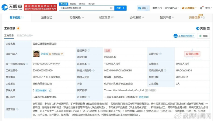 天眼查App显示,近日,云南亿捷锂业有限公司登记状态由存续变更为注销。此前,该公司已发布简易注销公告。