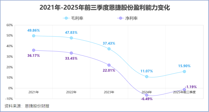 价格暴跌的后果,直接反映在恩捷股份的财报上:营收失速2023年增速由正转负,增长引擎熄火。利润崩塌2024年净利润亏损5.56亿,2025年前三季度继续亏损0.86亿。毛利率腰斩再腰斩从近50%的神坛,一路暴跌至2024年的11.07%。