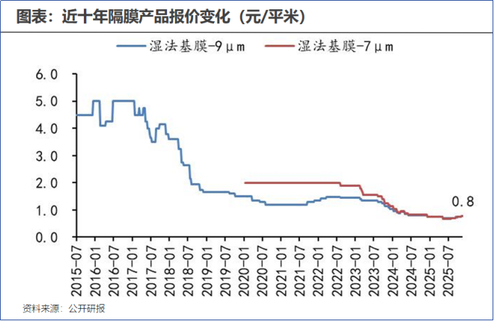 数据揭示了这场“雪崩”:主流的9微米湿法基膜价格,从高峰期的每平方米数元,一路跌至2025年下半年的0.8元左右,直逼行业成本线。