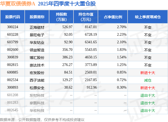 根据2025基金年报公募基金重仓股数据,重仓该股的公募基金共4家,其中持有数量最多的公募基金为华夏基金的华夏双债债券A。华夏双债债券A目前规模为20.94亿元,最新净值2.137(3月9日),较上一交易日下跌0.6%,近一年上涨13.57%。该公募基金现任基金经理为柳万军。柳万军在任的基金产品包括:华夏纯债债券A,管理时间为2017年9月8日至今,期间收益率为37.05%;华夏永康添福混合A,管理时间为2019年7月15日至今,期间收益率为93.83%;华夏鼎清债券A,管理时间为2020年12月3日至今,期间收益率为23.38%。