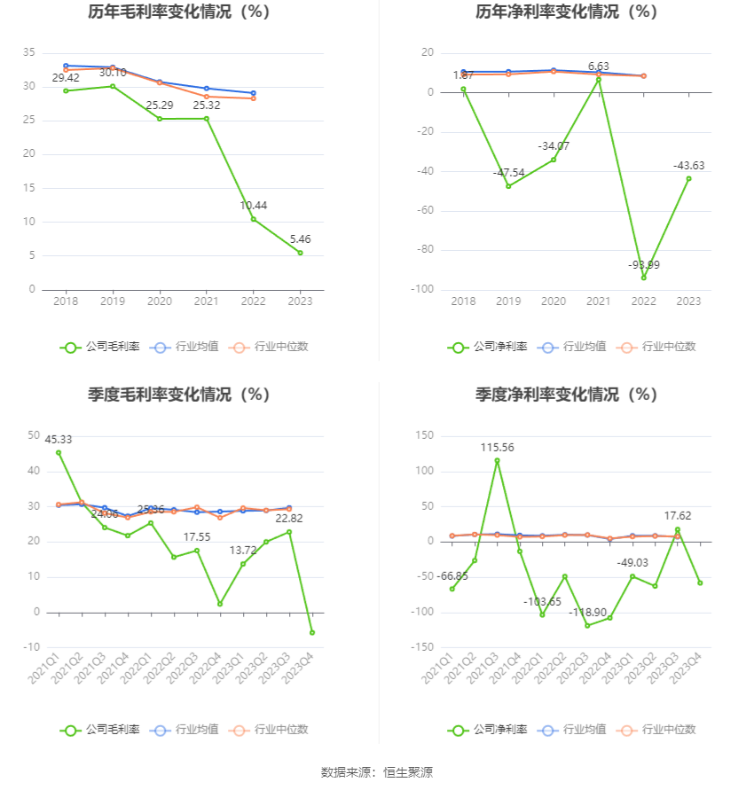 2023年,公司毛利率为5.46%,同比下降4.98个百分点;净利率为-43.63%,较上年同期上升50.36个百分点。从单季度指标来看,2023年第四季度公司毛利率为-5.77%,同比下降8.12个百分点,环比下降28.59个百分点;净利率为-58.32%,较上年同期上升49.49个百分点,较上一季度下降75.94个百分点。