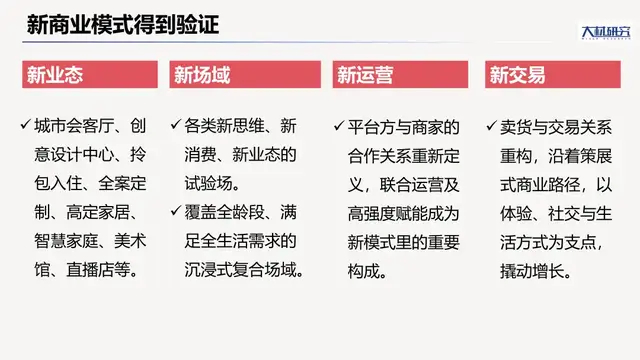 一是潮流消费业态呈现,例如城市会客厅、创意设计中心、大物流批发、拎包入住、全案定制、高定家居、智慧家庭、美术馆、直播店等。