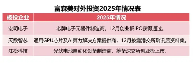 部分被投企业在2025年取得新的进展,例如12月时,宏明电子创业板IPO获得通过,这是一家老牌电子元器件制造商。投资方中,就有富森美的身影。