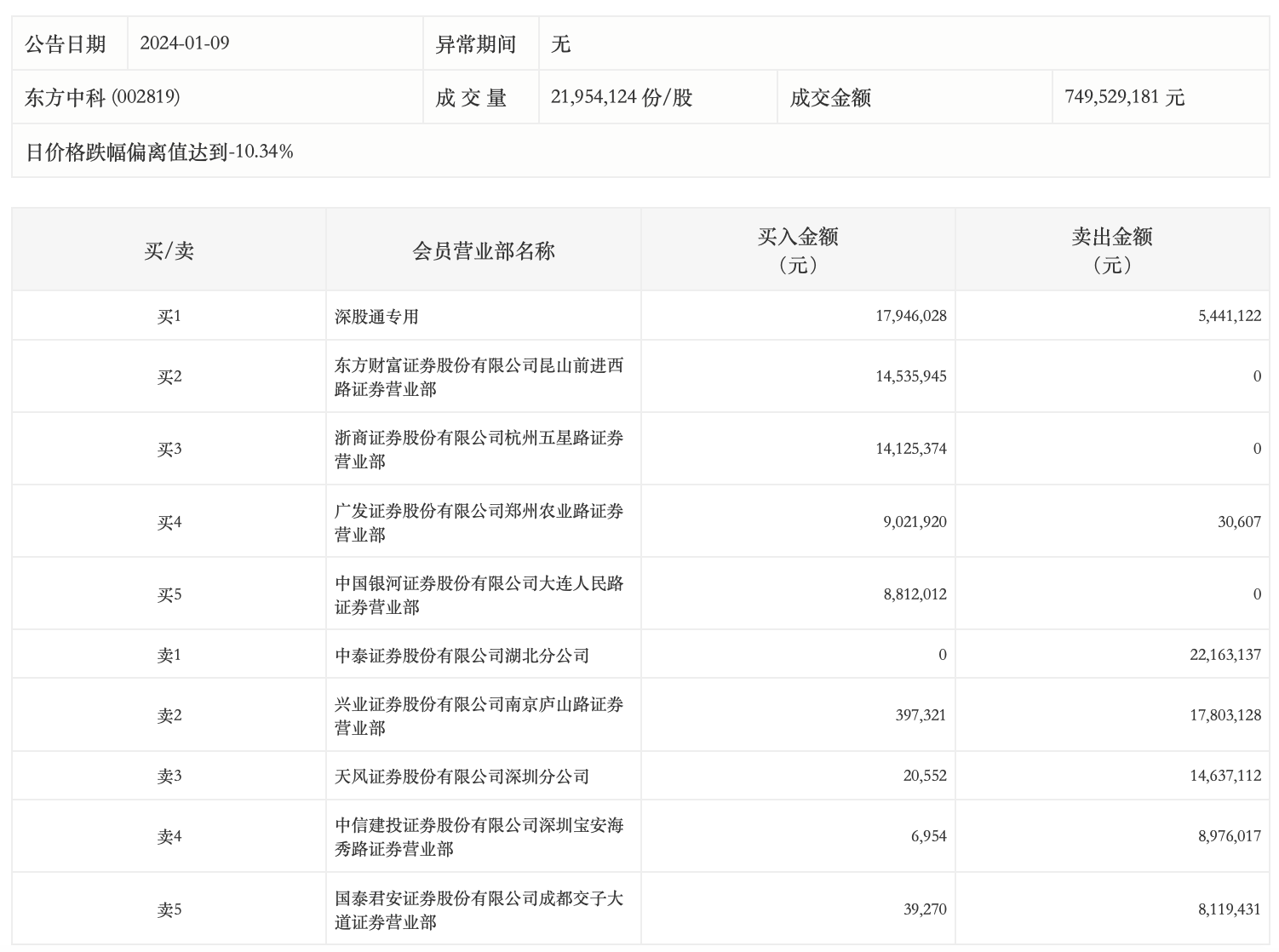 1月9日,东方中科今日跌停,全天换手率达9.36%,振幅达7.43%。龙虎榜数据显示,营业部席位合计净卖出1226.52万元。其中,中泰证券湖北分公司、兴业证券南京庐山路证券营业部分别卖出2216.31万元、1780.31万元;深股通专用、东方财富证券昆山前进西路证券营业部分别买入1794.60万元、1453.59万元。