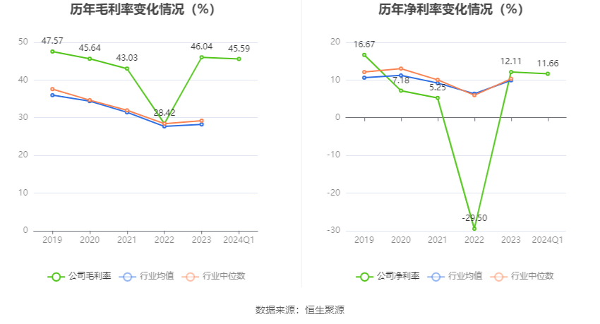 2024年第一季度,公司毛利率为45.59%,同比上升1.07个百分点;净利率为11.66%,较上年同期下降6.24个百分点。