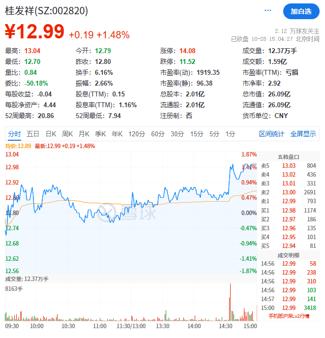 二级市场上,截至10月28日发稿,桂发祥涨1.48%,报12.99元/股,总市值26.09亿元。