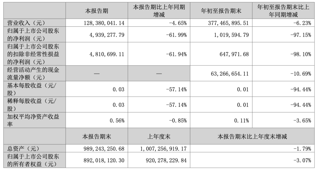 其中,第三季度营收为1.28亿元,下降4.65%;净利润为493.93万元,下降61.99%。