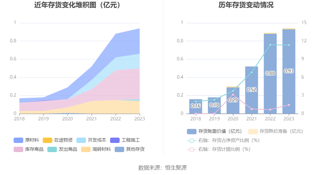 从存货变动来看,截至2023年年末,公司存货账面价值为9296.72万元,占净资产的11.34%,较上年末增加516.57万元。其中,存货跌价准备为137.31万元,计提比例为1.46%。