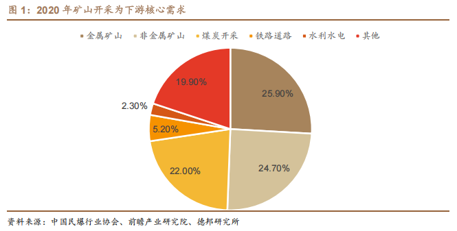 矿山开采为民爆行业下游主要需求。民用爆炸物主要用于煤炭、金属和非金属矿山的开采,2020年三类矿山占民爆产品销售量的72.6%,其中金属矿山、非金属矿山和煤炭开采分别占比25.9%,24.7%和22%,其余部分主要是铁路道路和水利水电等基建行业,占比分别为5.2%和2.3%,占比相对较少。