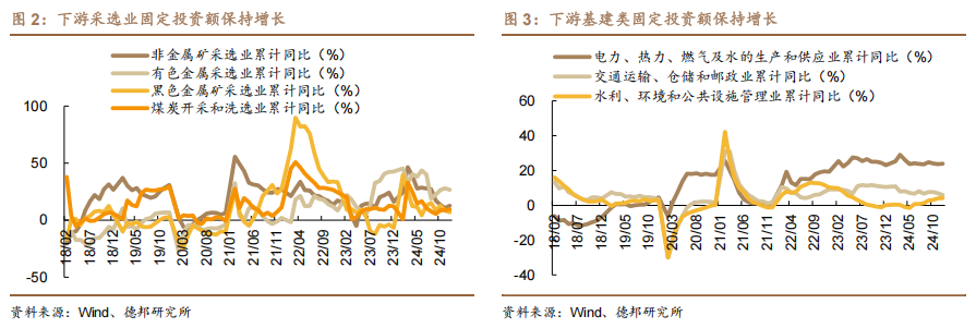 下游固定投资额稳步增长。我国的非金属/有色金属/黑色金属/煤炭采选业固定投资额稳步上涨,2024年累计同比分别为12.7%/26.7%/6.9%/9.4%。同时基建类固定投资额也保持上升态势,2024年电力、热力、燃气及水的生产和供应业/交通运输、仓储和邮政业/水利、环境和公共设施管理业固定投资额累计同比分别为23.9%/5.9%/4.2%。