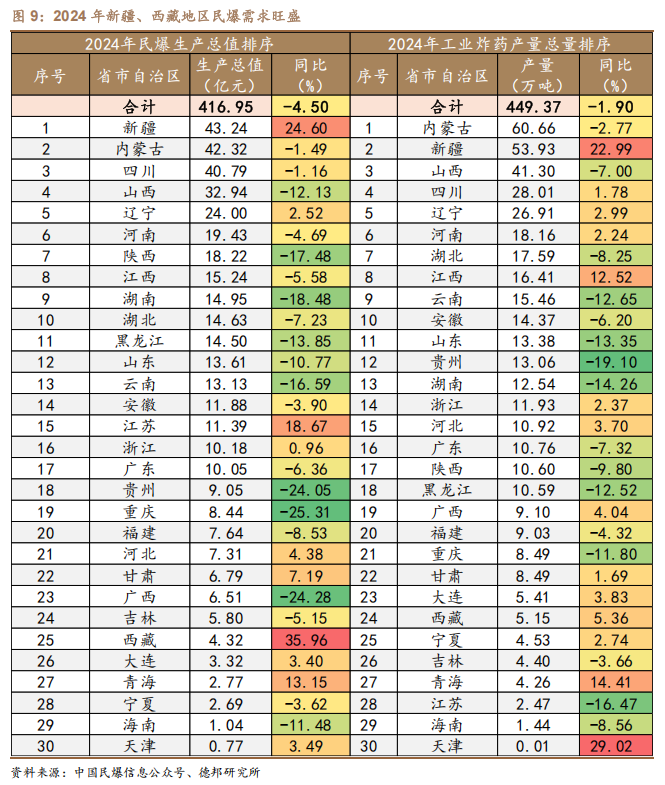 民爆广泛应用于矿山开采、煤炭开采、铁路道路、水利水电等领域,占比分别为50.6%、22.0%、5.2%和2.3%,下游与能源、基建息息相关。根据中爆协,2024年全年我国民爆生产企业累计完成生产、利润总额分别为417.0和96.4亿元,同比分别-4.5%和+13.04%;工业炸药累计产、销量分别为449.4万吨和448.5万吨,同比分别-1.90%和-1.70%,在宏观需求整体承压背景下行业整体展现了较强韧性,省市自治区间景气出现分化,2024年新疆/西藏炸药产量为53.9/5.15万吨,同比+23.0%/+5.36%,而债务较高区域因基建进展缓慢民爆需求有所受损,往后展望: