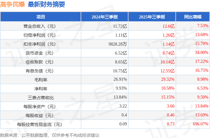据证券之星公开数据整理,近期高争民爆(002827)发布2025年三季报。截至本报告期末,公司营业总收入12.6亿元,同比上升7.53%,归母净利润1.26亿元,同比上升13.68%。按单季度数据看,第三季度营业总收入4.89亿元,同比上升9.12%,第三季度归母净利润5684.54万元,同比上升1.83%。本报告期高争民爆盈利能力上升,毛利率同比增幅8.98%,净利率同比增幅6.53%。
