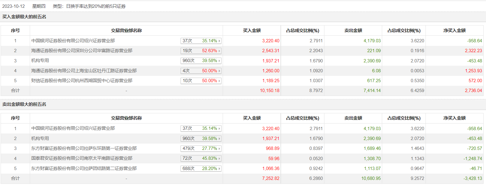 贝肯能源10月12日跌8.76%,全天换手率达47.71%,振幅达5.84%。龙虎榜数据显示,营业部席位合计净买入720.02万元。其中,机构买入1937.21万元,卖出2390.69万元,合计净卖出453.48万元。此外,赵老哥(中国银河证券绍兴证券营业部)、东方财富证券拉萨东环路第一证券营业部分别卖出4179.03万元、1689.46万元;赵老哥(中国银河证券绍兴证券营业部)、海通证券深圳分公司华富路证券营业部分别买入3220.40万元、2543.31万元。
