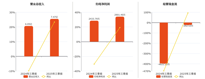 公司营业总收入为7.47亿元。归母净利润为2901.40万元。经营活动现金净流入为-292.53万元。