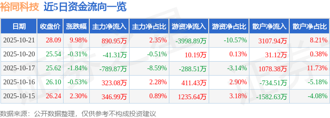 10月21日的资金流向数据方面,主力资金净流入890.95万元,占总成交额2.35%,游资资金净流出3998.89万元,占总成交额10.57%,散户资金净流入3107.94万元,占总成交额8.21%。
