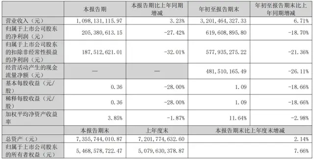 三季报显示,比音勒芬Q3单季度实现营收10.98亿元,同比增长3.23%;归母净利润2.05亿元,同比减少27.42%。