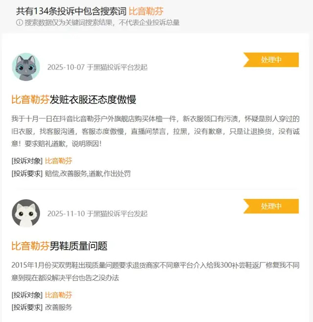 近来,比音勒芬频因质量问题遭到投诉。黑猫投诉平台上,以“比音勒芬”为关键词搜索,共出现超130条有关投诉,质量问题、售后问题等成为投诉“重灾区”。