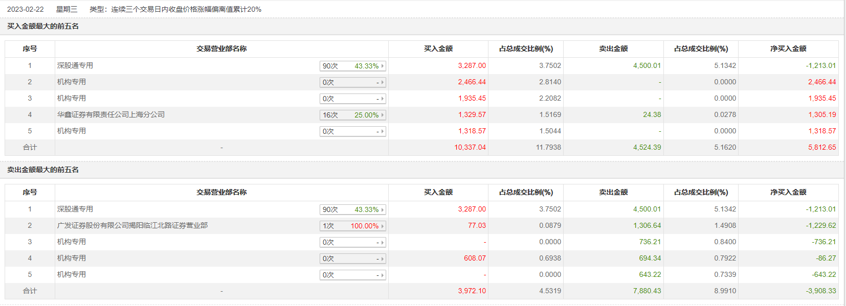具体来看,机构买入6328.53万元,卖出2073.78万元,合计净买入4254.75万元。此外,深股通专用、华鑫证券上海分公司分别买入3287.00万元、1329.57万元;深股通专用、广发证券揭阳临江北路证券营业部分别卖出4500.01万元、1306.64万元。
