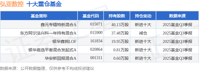 持有弘亚数控最多的基金为鑫元专精特新混合A,目前规模为0.97亿元,最新净值0.6536(10月30日),较上一交易日上涨0.14%,近一年上涨27.93%。该基金现任基金经理为陆杨。