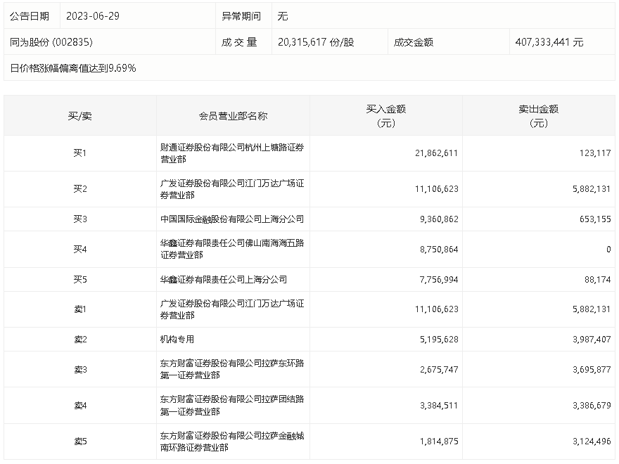 6月29日,同为股份今日涨停,龙虎榜数据显示,上榜营业部席位全天成交9284.98万元,占当日总成交金额比例为22.79%。其中,买入金额为7190.87万元,卖出金额为2094.1万元,合计净买入5096.77万元。
