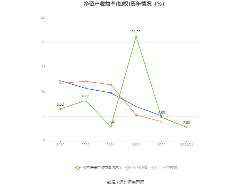 数据显示,2024年第一季度公司加权平均净资产收益率为2.80%,较上年同期增长2.03个百分点;公司2024年第一季度投入资本回报率为2.88%,较上年同期增长2.12个百分点。