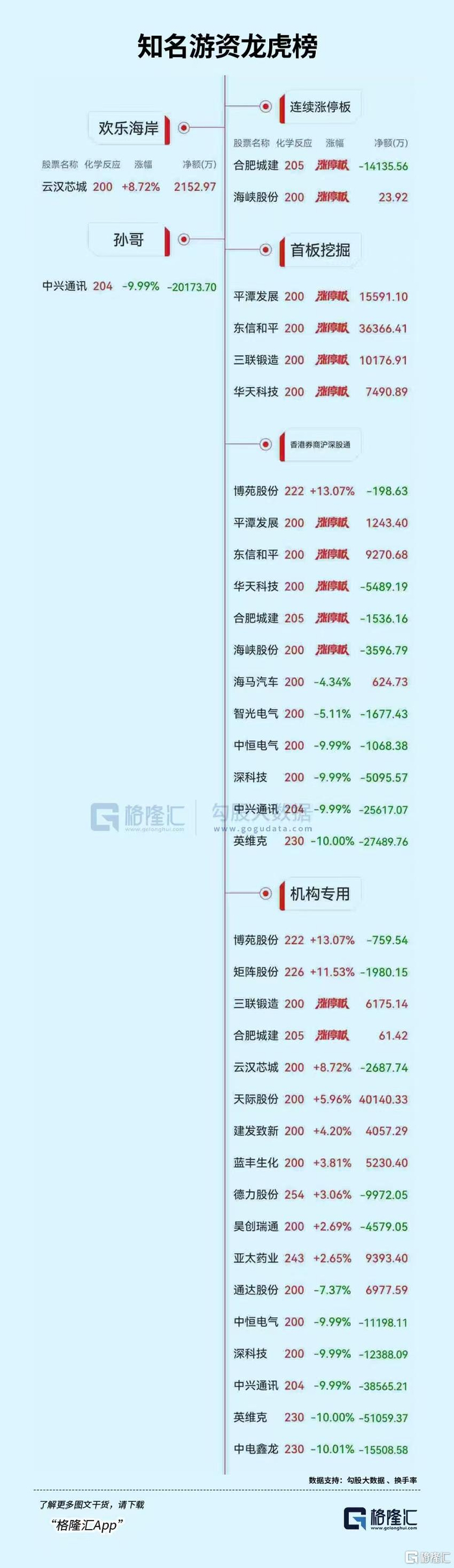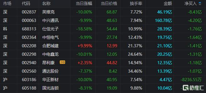 龙虎榜单日净卖出额前三为英维克、中兴通讯、仕佳光子,分别为8.43亿元、4.20亿元、1.76亿元。