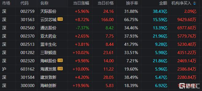 通达股份:今日跌7.37%,换手率34.46%,振幅6.71%,成交额13.39亿元。龙虎榜数据显示,4机构净买入6977.60万元。