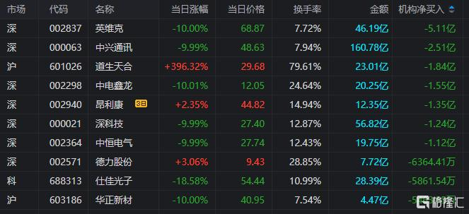 龙虎榜中涉及机构专用席位的个股中,当日净卖出额前三为英维克、中兴通讯、道生天合,分别为5.11亿元、2.51亿元、1.84亿元。