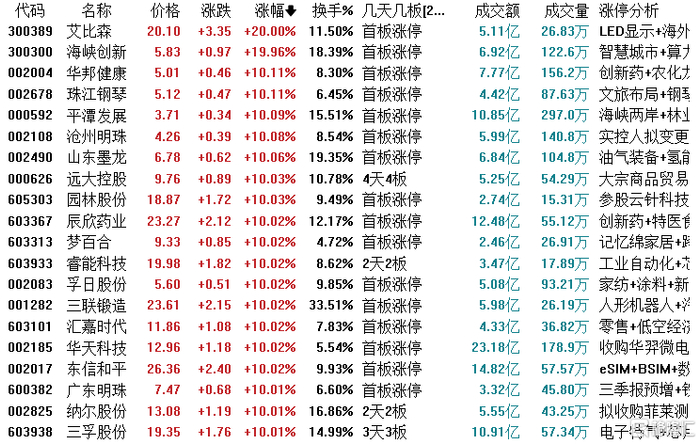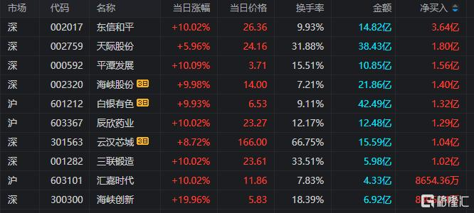 龙虎榜单日净买入额前三为东信和平、天际股份、平潭发展,分别为3.64亿元、1.80亿元、1.56亿元。