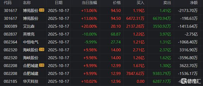 中恒电气:今日跌停,换手率12.43%,振幅11.39%,成交额19.75亿元。龙虎榜数据显示,2机构净卖出1.12亿元,深股通专用席位净卖出1068.40万元,湖里大道净卖出6675万元,N周二净买入2832万元。