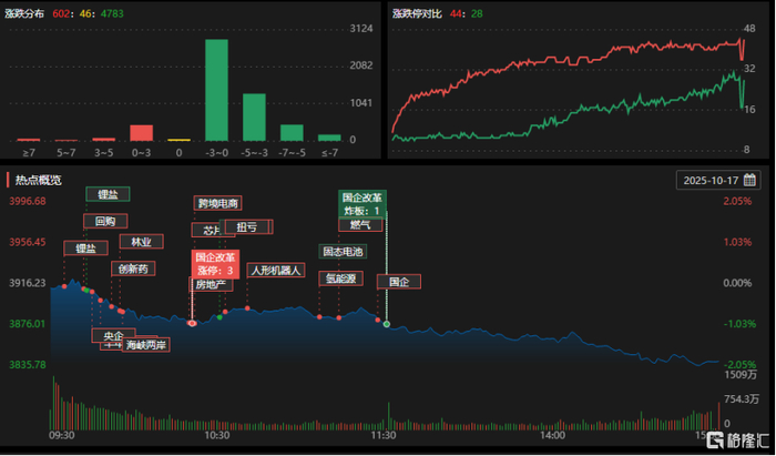 10月17日,沪指跌1.95%,深成指跌3.04%,创业板指跌3.36%。全市场成交额1.95万亿元,较前一交易日增量57亿元。贵金属、燃气、机场航运板块表现相对积极,电网、光伏、风电、可控核聚变等下跌。