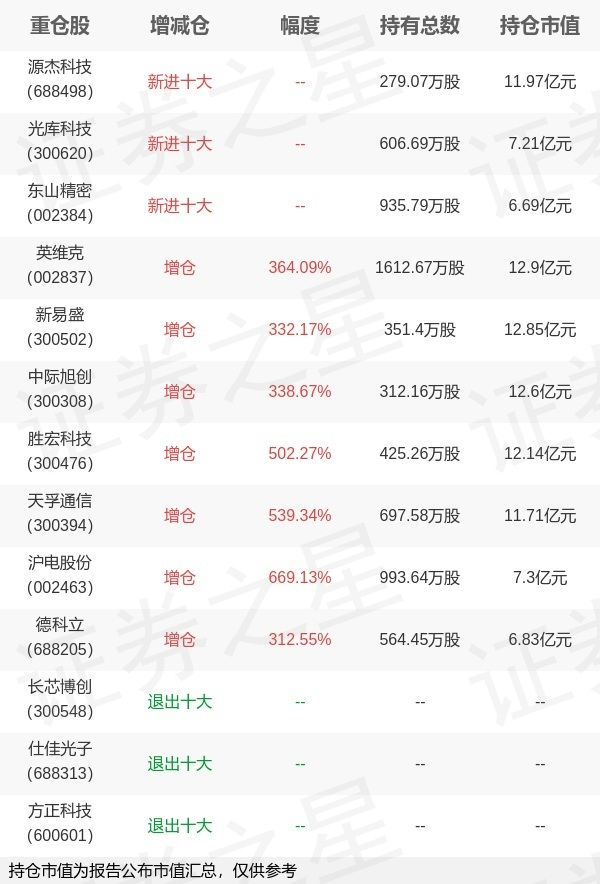 证券之星消息,10月27日中航基金旗下韩浩管理的中航机遇领航混合型发起式基金公布三季报,近1年净值增长率119.56%。与上一季度相比,该基金前十大重仓股新增源杰科技,光库科技,东山精密;并对英维克增仓1265.18万股,为该基金第一大重仓股;长芯博创,仕佳光子,方正科技等退出前十大重仓股;详细数据如下: