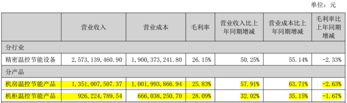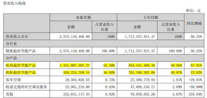今年上半年,受益于下游应用领域的火热,机房温控产品营收同比高增58%,较机柜温控产品同期增速高了近26个百分点,这块业务在总营收中的占比也进一步升至52.5%。