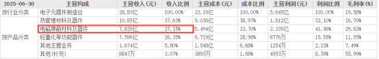 这个转型相当成功。飞荣达从最初的海外代理逐步发展到自主研发,陆续拿下了戴尔、诺基亚、联想、微软等巨头的订单。到2025年上半年,电磁屏蔽材料业务贡献了7.83亿收入,占总营收的27%,成为不可或缺的支柱业务。