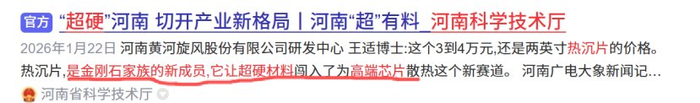 1月22日,河南省科技厅官微消息,热沉片是金刚石家族的新成员,它让超硬材料成功进入高端芯片散热这个新赛道。