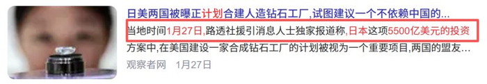 1月27日,据知情人士透露,作为东京方面总额5500亿美元对美投资计划的一部分,日本与美国正考虑投资建设一座合成钻石生产工厂。