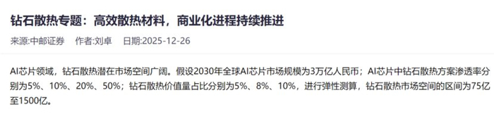 中邮证券还进一步表示,AI芯片领域,钻石散热潜在市场空间广阔。假设2030年全球AI芯片市场规模为3万亿人民币;AI芯片中钻石散热方案渗透率分别为5%、10%、20%、50%;钻石散热价值量占比分别为5%、8%、10%,进行弹性测算,钻石散热市场空间的区间为75亿至1500亿。