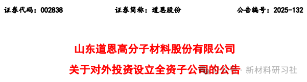 在转让新材料子公司股权的同时,道恩股份同步宣布:拟使用1000万元自筹资金,设立山东道恩科技有限公司(暂定名,最终以市场监管部门登记为准) ,且新公司为道恩股份全资持股。