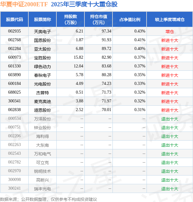 根据2025基金Q3季报公募基金重仓股数据,重仓该股的公募基金共1家,其中持有数量最多的公募基金为华夏基金的华夏中证2000ETF。华夏中证2000ETF目前规模为2.27亿元,最新净值1.7586(1月6日),较上一交易日上涨1.1%,近一年上涨65.73%。该公募基金现任基金经理为鲁亚运 陈国峰。鲁亚运在任的基金产品包括:华夏创业板成长ETF联接A,管理时间为2022年6月10日至今,期间收益率为6.57%;华夏中证全指证券公司ETF联接A,管理时间为2022年6月10日至今,期间收益率为32.81%;华夏国证疫苗与生物科技指数发起A,管理时间为2022年9月6日至今,期间收益率为-32.53%;华夏战略新兴成指ETF联接A,管理时间为2023年3月27日至今,期间收益率为35.48%。陈国峰在任的基金产品包括:华夏中证800指数增强A,管理时间为2023年3月30日至今,期间收益率为20.99%;华夏中证A500增强策略ETF,管理时间为2025年8月6日至今,期间收益率为14.55%;华夏中证2000ETF发起式联接A,管理时间为2025年9月9日至今,期间收益率为7.54%。