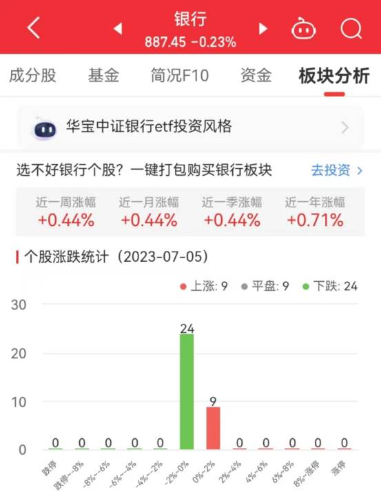 中国经济网北京7月5日讯今日,银行板块整体跌幅0.23%,其中9只股票上涨,9只股票平盘,24只股票下跌。