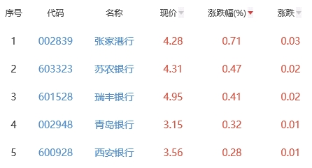 其中,张家港行、苏农银行、瑞丰银行、青岛银行、西安银行位列板块涨幅前五位,涨幅分别为0.71%、0.47%、0.41%、0.32%、0.28%。