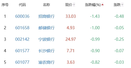 招商银行、邮储银行、宁波银行、长沙银行、渝农商行位列涨幅榜后五位,涨幅分别为-1.43%、-1.00%、-0.99%、-0.90%、-0.82%。