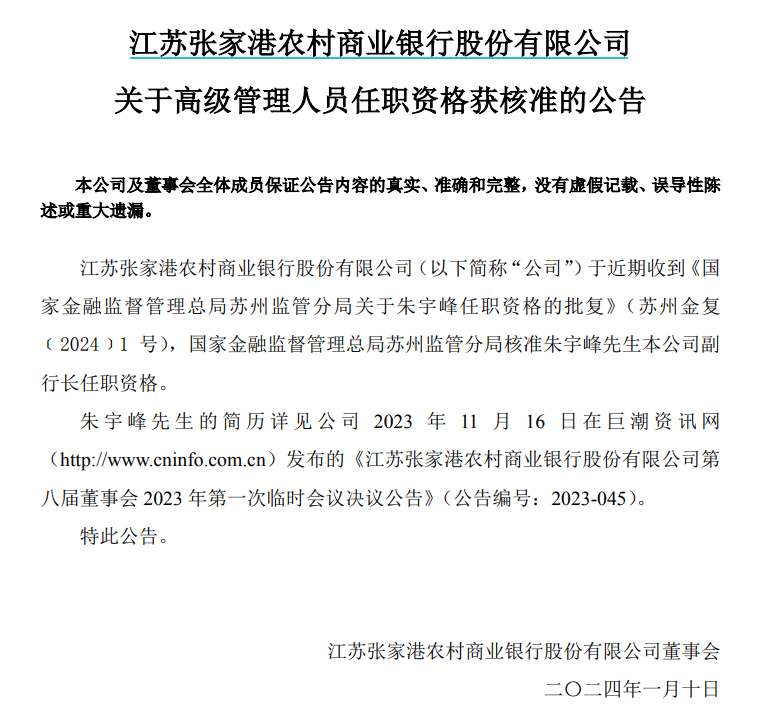 发布公告称,该行于近期收到《国家金融监督管理总局苏州监管分局关于朱宇峰任职资格的批复》,国家金融监督管理总局苏州监管分局核准朱宇峰该行副行长任职资格。